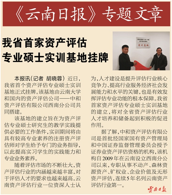 2014年12月19日,中和資產(chǎn)評估有限公司西南分公司正式掛牌成為云南大學(xué)“資產(chǎn)評估專(zhuān)業(yè)碩士實(shí)訓基地”,這是云南省內首個(gè)資產(chǎn)評估專(zhuān)業(yè)碩士實(shí)訓基地,云南日報在資訊版對此做了專(zhuān)題報道。