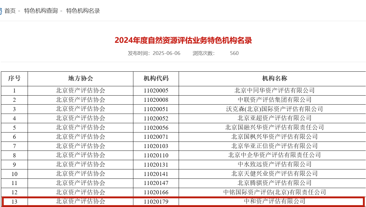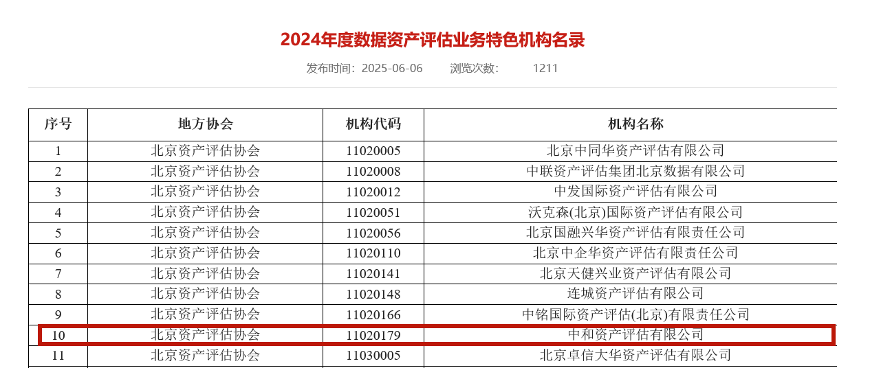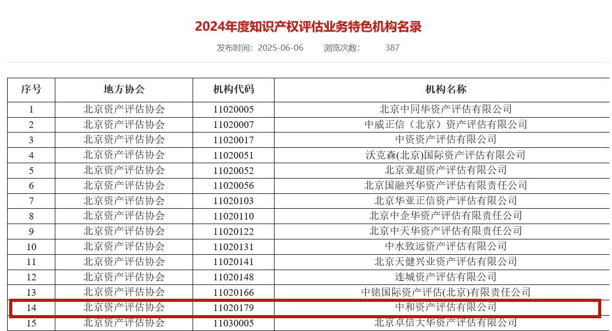 2025年6月6日,中國資產(chǎn)評估協(xié)會(huì )(以下簡(jiǎn)稱(chēng)“中評協(xié)”)公布了2024年度特色機構名單。中和評估憑借在知識產(chǎn)權、自然資源及數據資產(chǎn)評估領(lǐng)域的卓越專(zhuān)業(yè)能力和豐富實(shí)踐經(jīng)驗,成功入選中評協(xié)最新發(fā)布的《2024年度知識產(chǎn)權評估業(yè)務(wù)特色機構名錄》、《2024年度自然資源評估業(yè)務(wù)特色機構名錄》以及《2024年度數據資產(chǎn)評估業(yè)務(wù)特色機構名錄》。這一榮譽(yù)標志著(zhù)我們在多個(gè)核心評估領(lǐng)域獲得了行業(yè)的權威認可,專(zhuān)業(yè)實(shí)力再上新臺階!